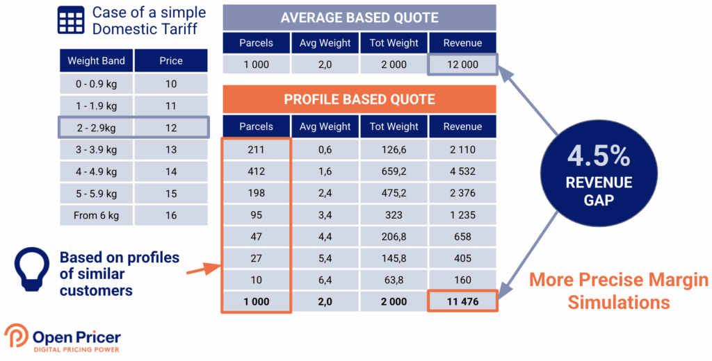 They base quotes on actual shipment profiles, leveraging historical data to build realistic simulations. A more accurate simulation based on a customer’s real shipping mix (weight, volume, distance, etc.) ensures that you are quoting on a profitable basis. Shipping Profiler, provided by Open Pricer, uses real shipment mixes from similar customers when the profile provided in a quote is incomplete. This improves revenue and margin simulation accuracy by up to 5%. For instance, Imagine quoting based on an “average parcel weight” of 2 kg. For 1,000 parcels, this looks like €12,000 in revenue. But when the true distribution is applied — with most parcels in lower weight bands — actual revenue drops to €11,476. That’s a 4.5% revenue gap (see Figure 1).